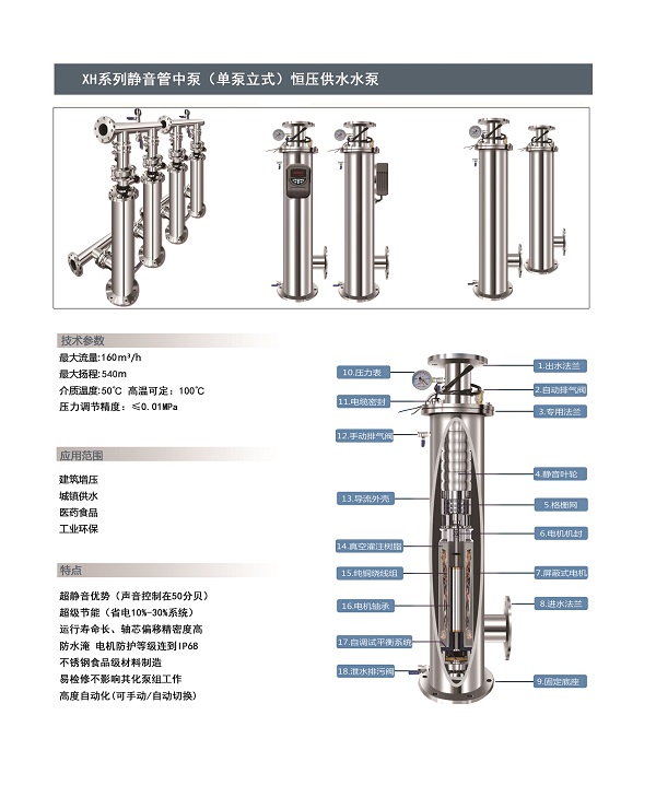 靜音節能管中泵 ; XH系列靜音管中泵(單泵立式)恒壓供水水泵; XH系列靜音管中泵(無負壓)恒壓供水水泵;靜音節能供水;XH系列無負壓靜音管中泵(雙泵立式)恒壓供水水泵。